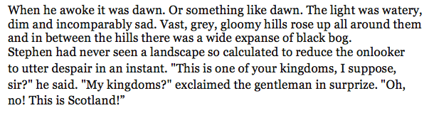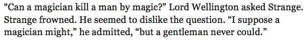 What I like most about historical fiction is seeing the characters taking part in world events; in this novel they run parallel to actual history (except for the whole ‘England was invaded and ruled by a magician king for 300 years’ bit) and are tweaked most interestingly. We get to know a few historical figures – King George III (he’s still mad,) Lord Byron is hilarious, and the Duke of Wellington is…well, awfully dashing really. All of the characters are fascinating, and human and flawed and you care about them (well, all except one) which is testament to Clarke’s talent in creating realistic characters.