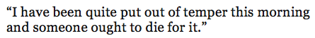 My favourite part of Pride and Prejudice (aside from the romantic resolution – sigh) is where Elizabeth tells Lady Catherine (de Bourg Bitchface) to get stuffed, in a no less effective manner despite remaining infuriatingly polite and all stiff-upper-lippy, which is quintessentially British. I wish I could do that to people who piss me off, because nothing would piss them off more.