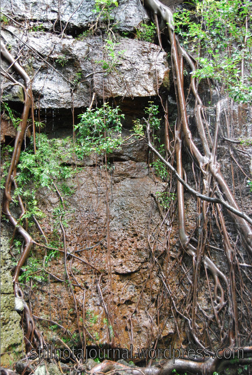 Down the road from the visitor centre carpark we found the trailhead for the Lower Bellbird Circuit which led to our walk. The track skirted the foot of the cliffs below Binna Burra and Bellbird Lookout; on one side the Numinbah Valley stretched out below us, and on the other the soaring rock face had lichen, roots, and entire trees growing out of it. The track passed shallow caves and beneath massive fallen trees.