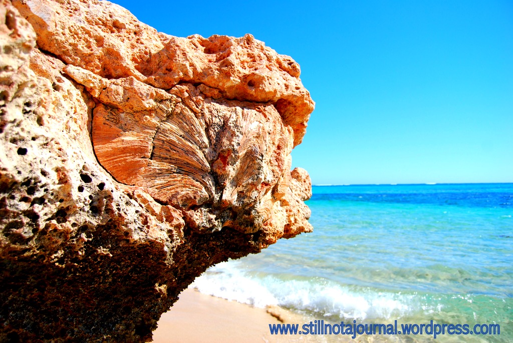 Left Vlamingh Head Lighthouse and continued around the headland into Ningaloo Marine Park. “Ningaloo” is an Aboriginal word for promontory; I’m unsure which language group it’s from but the Cape’s original inhabitants were known as the Yinigudura people. I couldn’t find out much about them; they apparently left the cape before white settlement. Why – who knows? But Dave mentioned a large gap was discovered in the reef with pieces of it quite far inland… possibly a tsunami, between two and five thousand years ago.