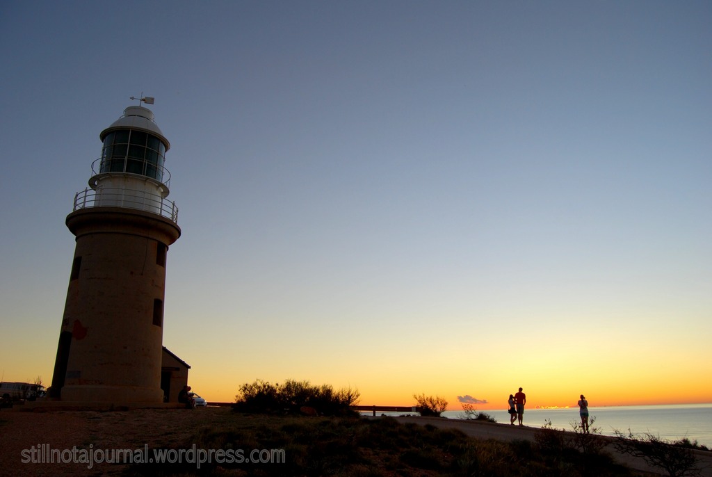 End of Day 3. I very nearly did miss the sunset! Squealed out of the Turquoise Bay carpark (literally, thanks to that bloody fanbelt) at 5 past 5 then floored it the 45km back to Vlamingh Head, slowing down for the odd kangaroo. I hooned up the hill to the lighthouse, pulled over in a shower of dirt and jumped out to see the sun touching the horizon.