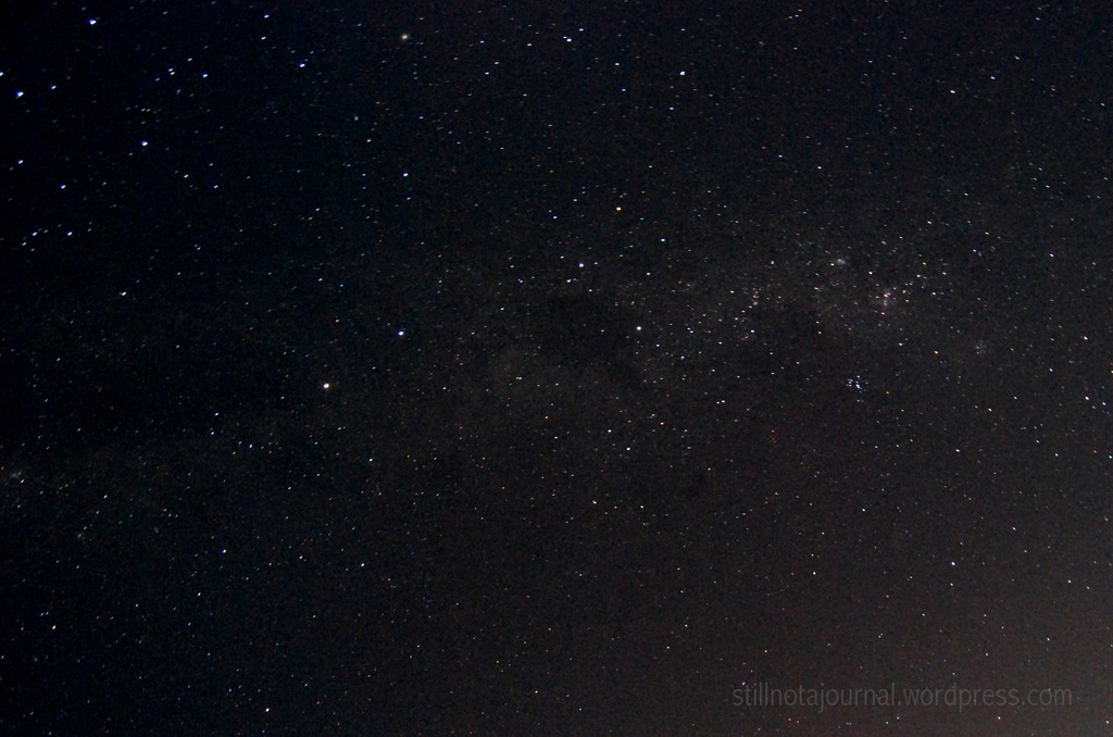 I love seeing their colours! Fiddled around with settings and exposures trying to get brighter stars without the blur; didn’t work. I’ve heard of a process called ‘stacking’, whereby you take literally hundreds of 30 second exposures then use a special program to combine them into one image. The main advantage is that the stars’ brightness is like that of a long exposure but the background sky will stay as dark as a shorter one – filed it under ‘give it a go later’.